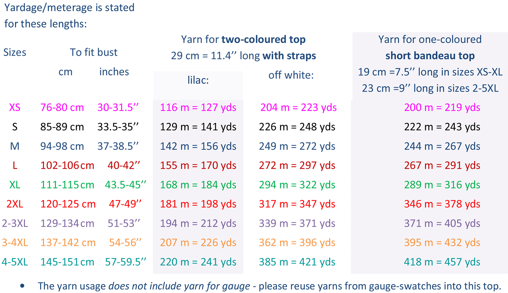 In the bandeau top you will work rows 1-21 once in sizes XS-XL; in sizes 2-5XL you will work rows 1-8 once, repeat rows 6-8 once, then work rows 9-21 once.