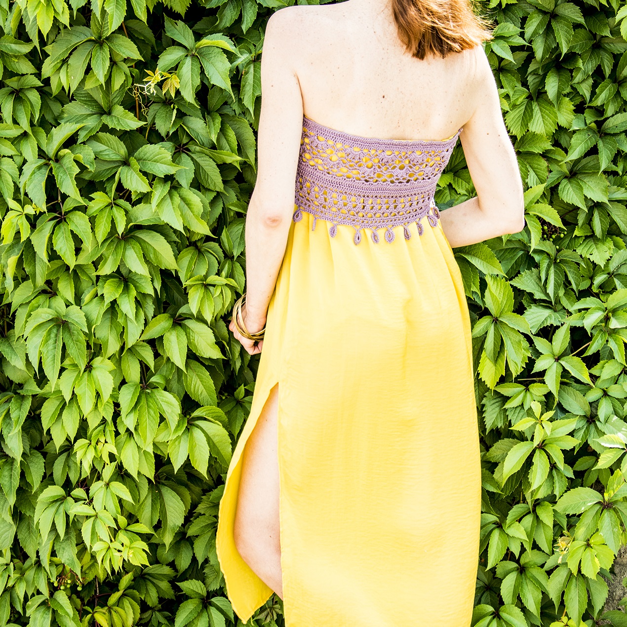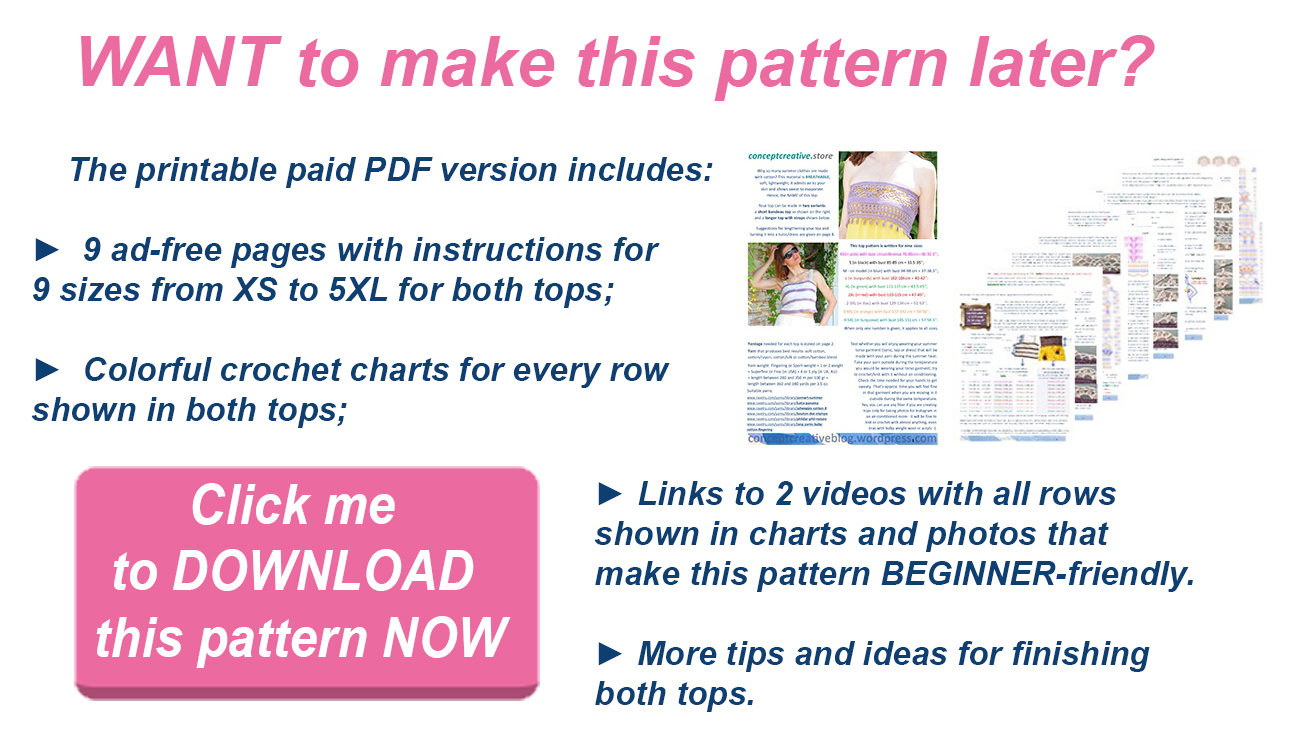 Your top can be made in two variants: a short bandeau top and a longer top with straps. Suggestions for lengthening your top and turning it into a crochet dress or tunic are given as well.
