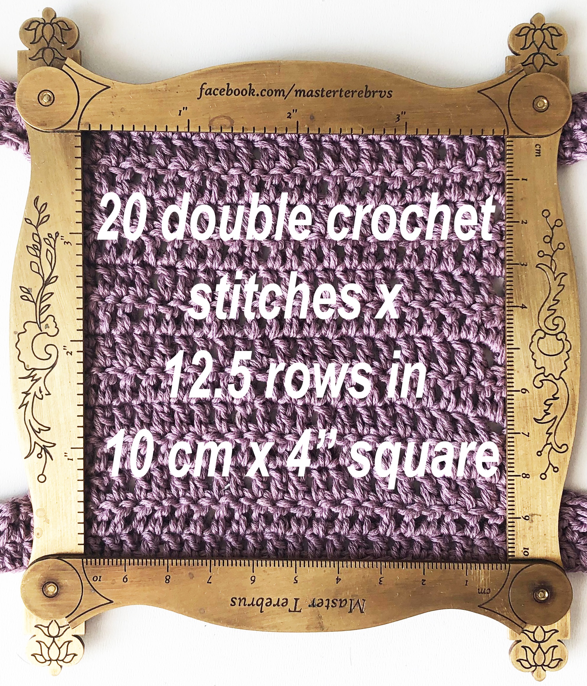 HOOK size: 2.5 mm or hook needed to obtain gauge (every crocheter has her own tension). The calculations for all sizes are based on the width of 20 double crochet stitches 10 cm = 4’’ and length of 12-12.5 rows 10 x 4’’. See my gauge-swatch below. Your stitches should be measured after washing and blocking your swatch.