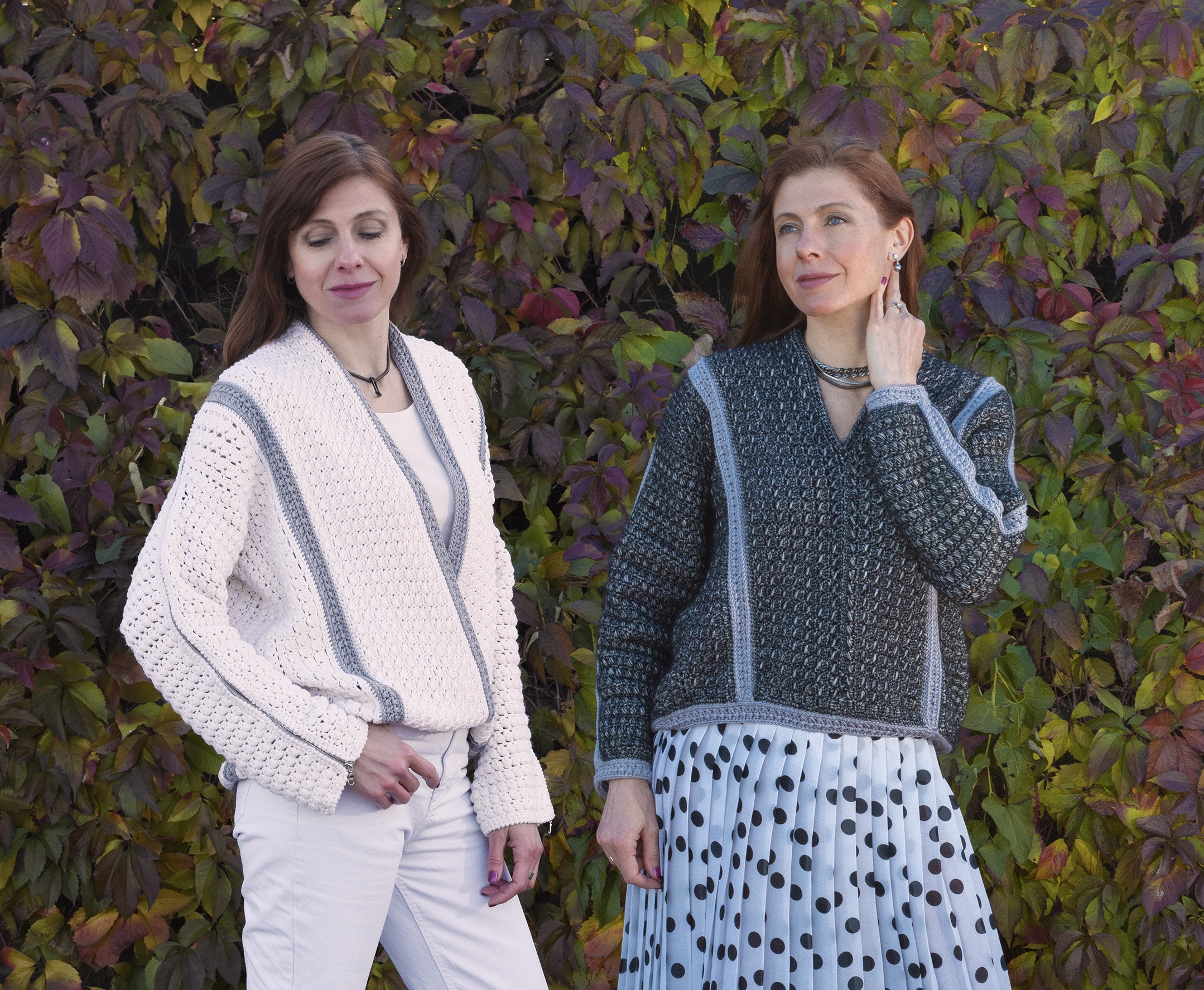 Featured: black pullover sweater in size S-M without zippers, and white cardigan in size M-L with zippers along sleeves. This pattern is written for both garments so you can choose to crochet yours with or without zippers.