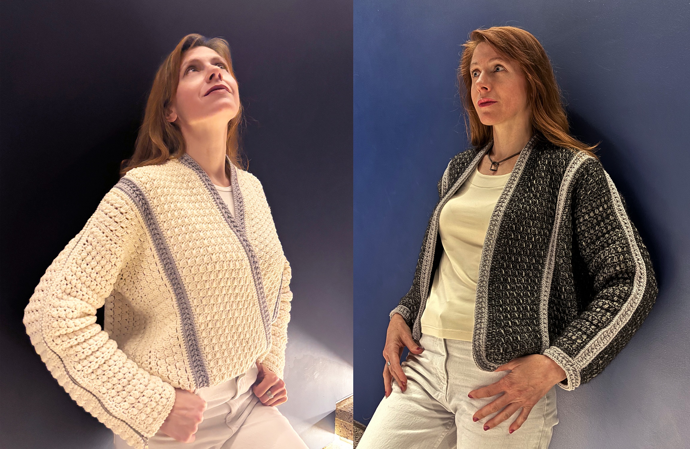 Welcome the BRICOLAGE cardigan and pullover sweater, a crochet exploration of contrasts: smooth and textured, structure and softness, light and dark, calm and bold.