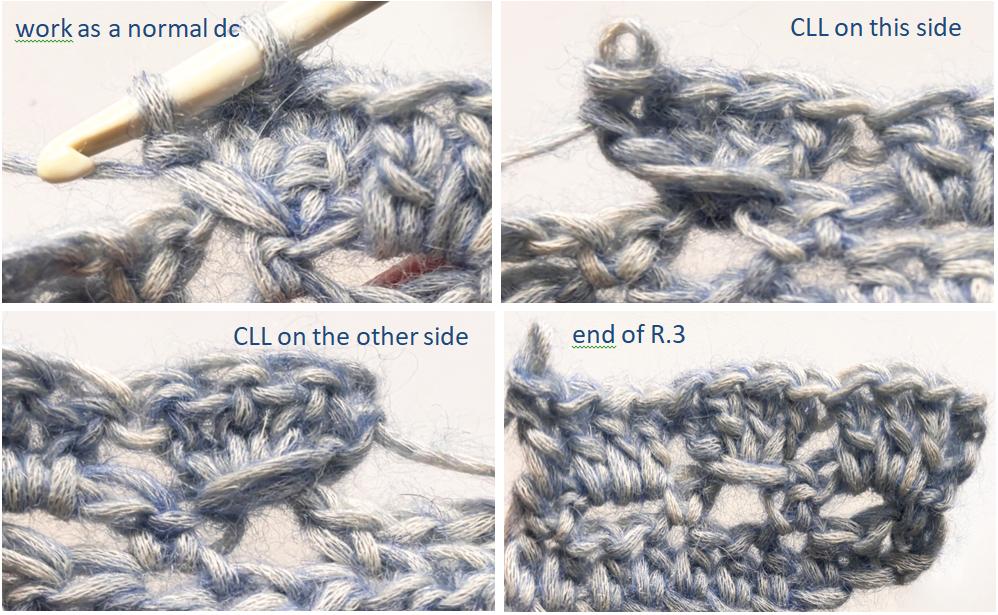 CLL (crossed long loop): skip 1 st and work 3 dc in 2-ch-space, then yarn over, insert hook in skipped st crossing 3 dc just made, yarn over (grab from behind), pull through and up, work 3 loops on hook as a regular dc.