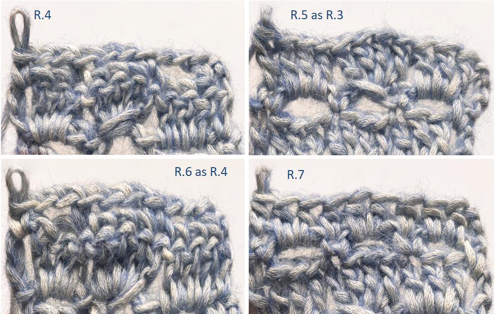 Thus, the main pattern is a 2 row repeat. Repeat Rows 3-4 until your work reaches 5 rows with CCL or until it reaches your desired length, finish with a repeat of Row 4.