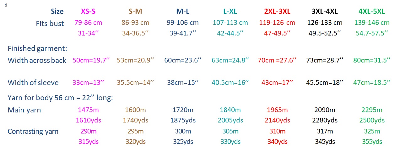 Yarn amounts are given for two body lengths measured from shoulder to hem: 63 cm = 24.8’’ and 56 cm = 22’’. To change the length of body, add or subtract stitches after finishing sleeve. For example, here are yarn requirements for body 56 cm = 22’’ long: